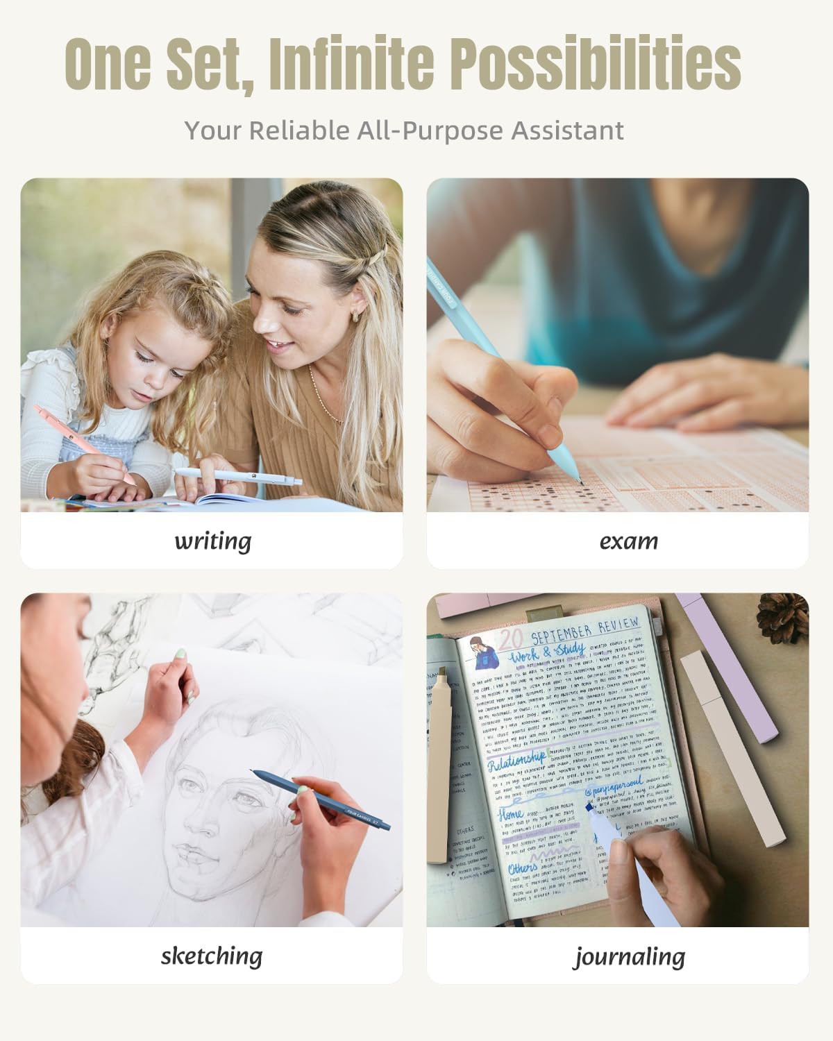 - All-in-One Bulk Pack: This pack includes 12 pastel-colored highlighters, 6 adorable mechanical pencils, 5 black ink gel pens, 5 gel pen refills, a charming pink pencil pouch, 3 jelly erasers, 9 cap erasers, and 6 tubes of lead refills; It's the ultimate collection of multifunctional stationery essentials for office and school supplies