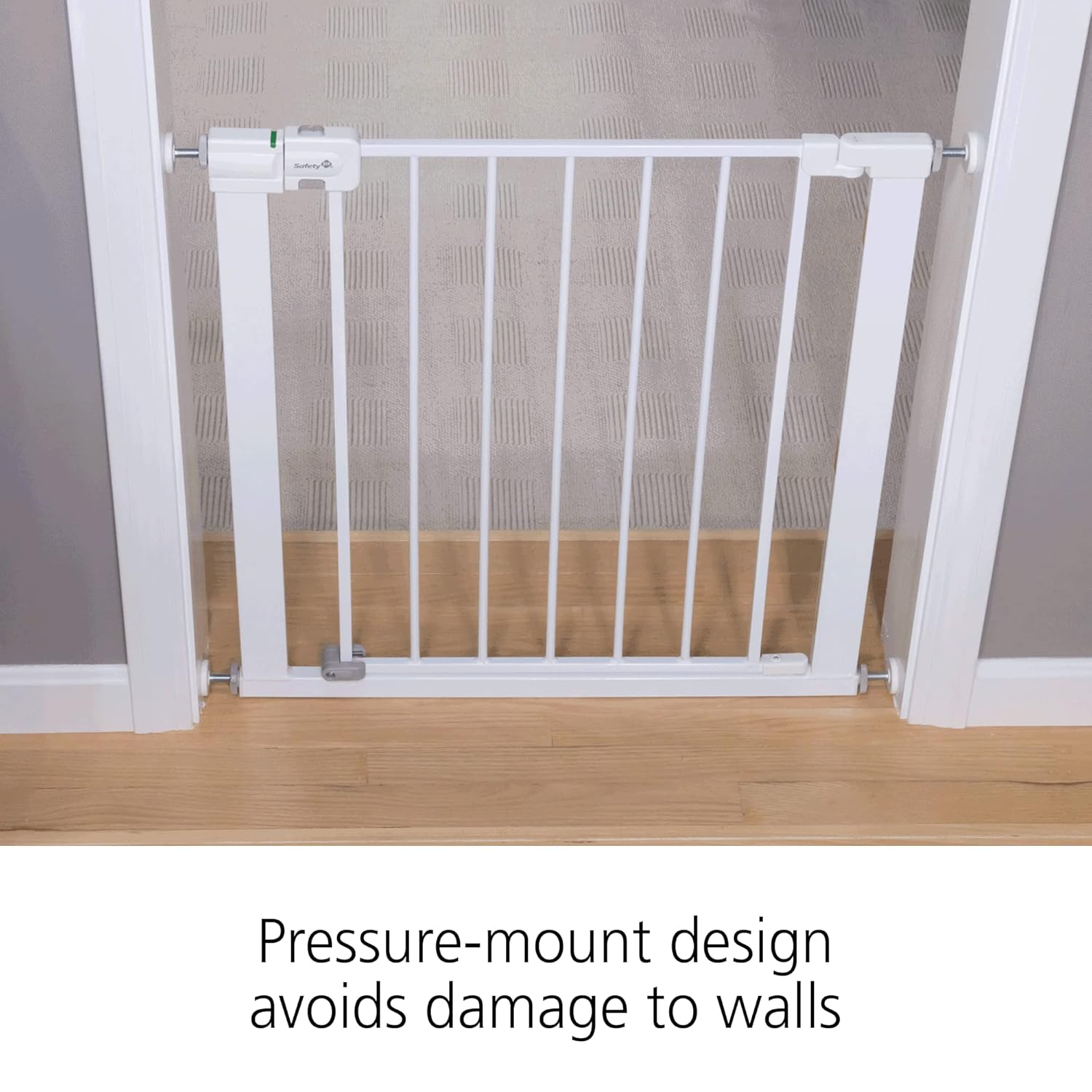 No tools required. This pressure-mounted baby gate installs quickly and includes four wall cups for added security. Note: Do not use pressure-mounted gates at the top of stairs.