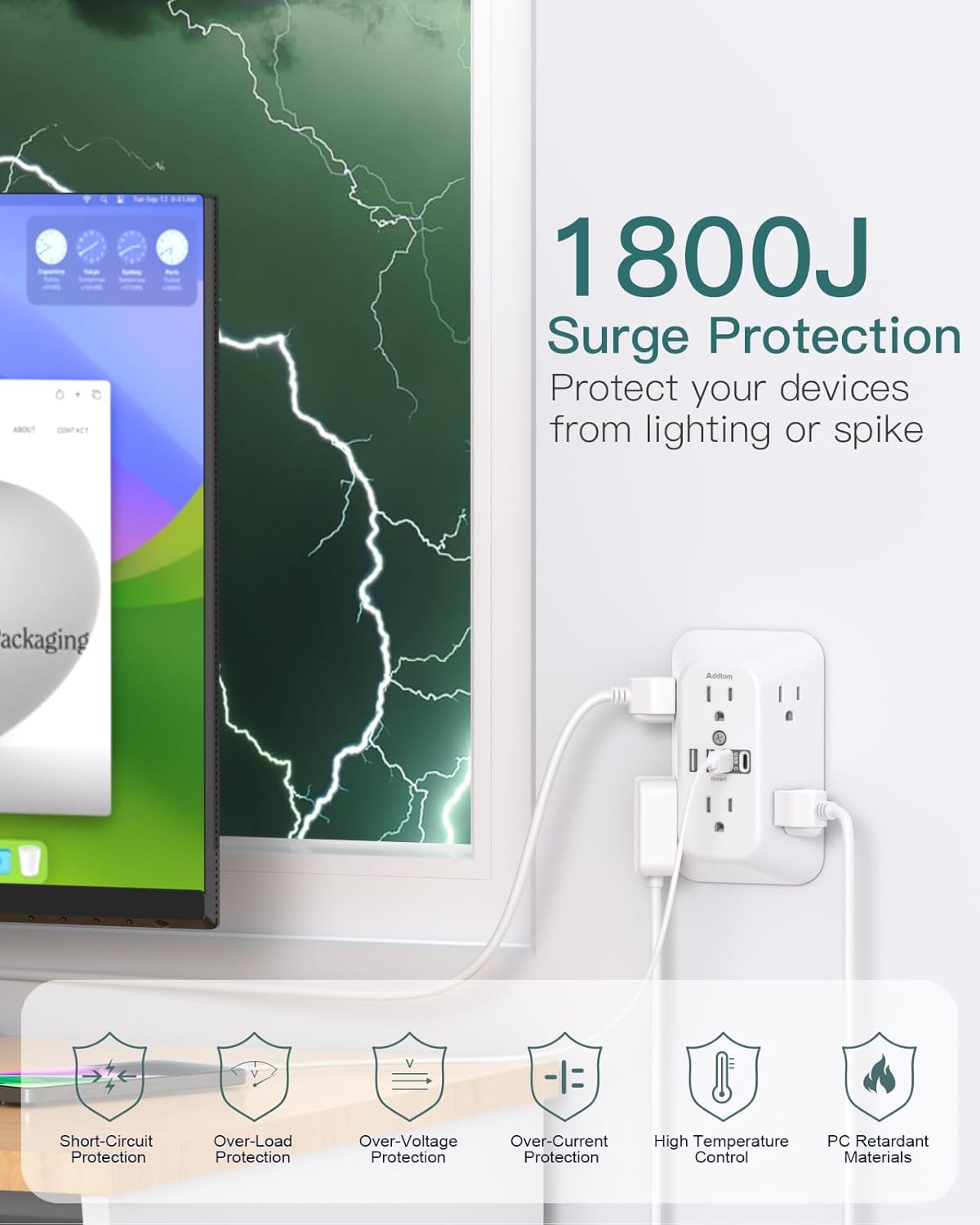 - Addtam Surge Protector Outlet Extender, 6-Outlet Splitter with 4 USB Wall Charger(2 USB-C Ports), Multi Plug Wall Outlet 1800J Power Strip for Home Office Dorm Room Essentials