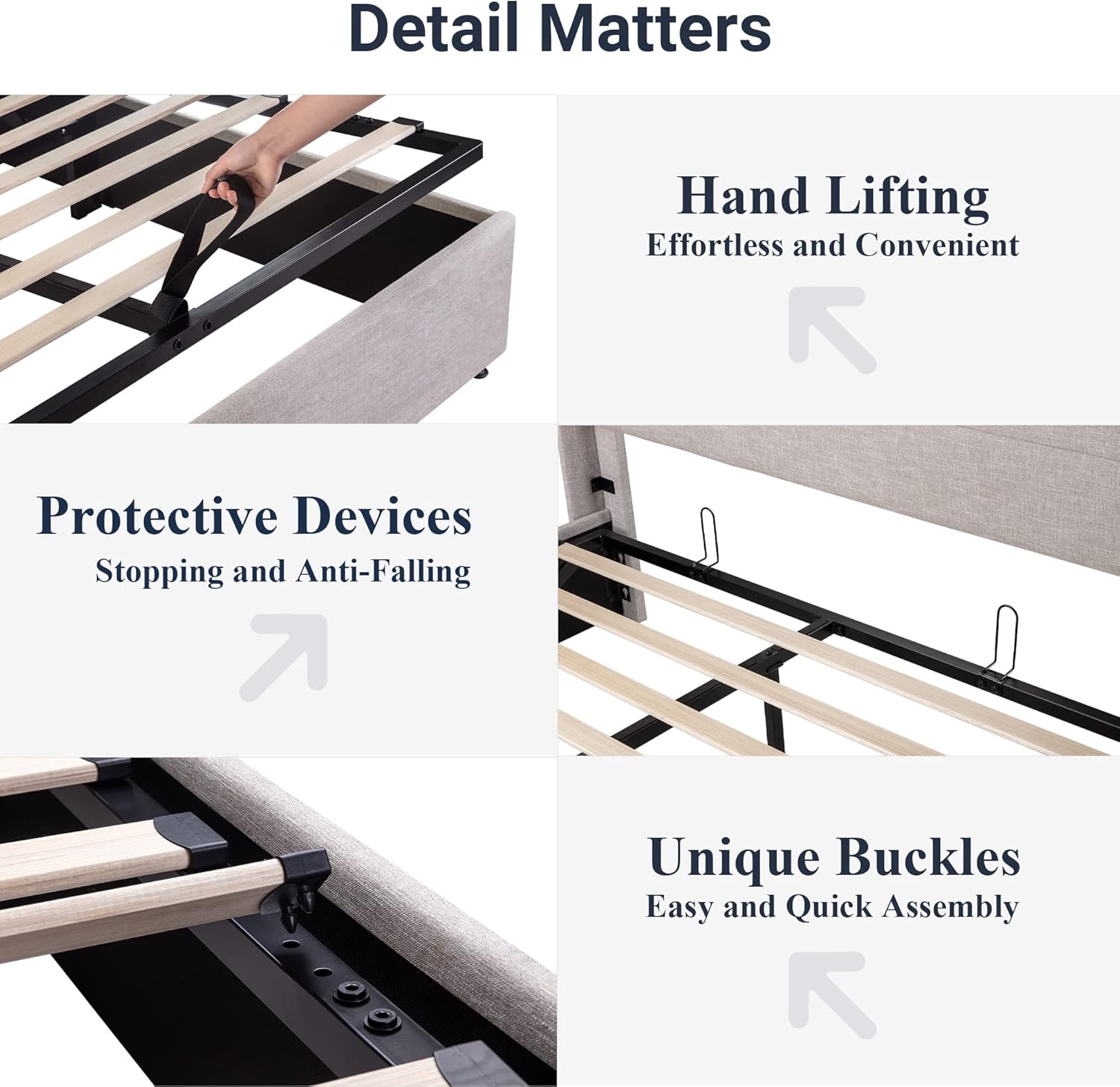 - Space-Saving Storage: With its lifting up storage feature, this bed frame provides ample space to store extra bedding, clothing, shoes, and other items, especially helpful for smaller bedrooms or apartments where storage space is limited
