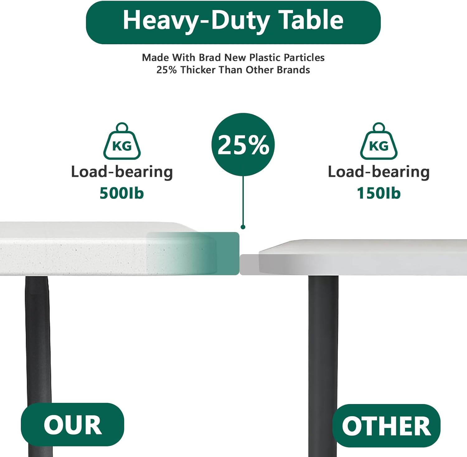 - Heavy Duty Construction Built with reinforced steel legs and a high-density plastic tabletop; this table won’t wobble under pressure! It holds up to 300 lbs., making it ideal for camp table, buffet spreads, wedding desserts, camping gear, or workshop projects. The powder-coated steel frame prevents rust, while the thick plastic surface resists cracks and dents, making it suitable for both utility and dining use.