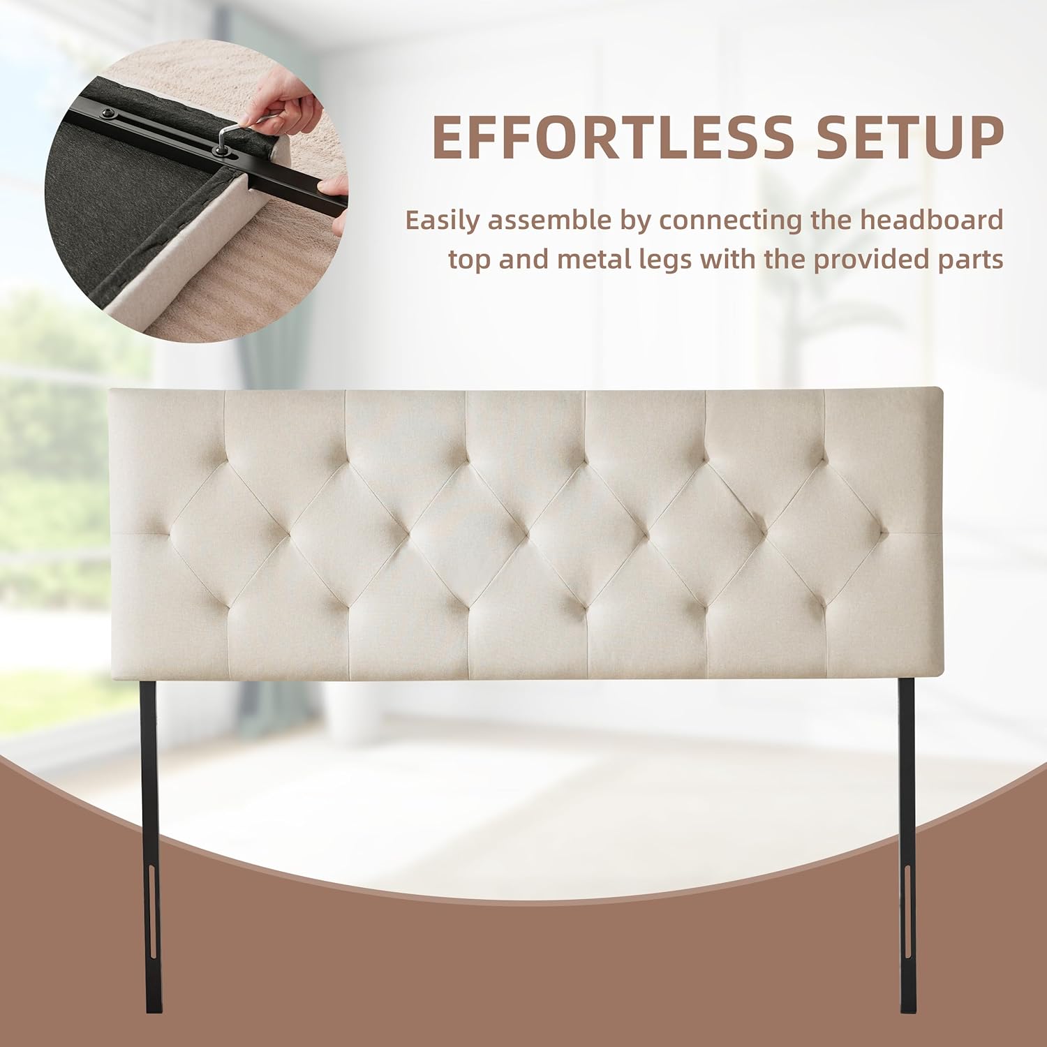 Linen Fabric Upholstered Headboard Queen Size, Modern Diamond Tufting Solid Wood Queen Headboard Only, Adjustable Height from 37” to 51” Head Board, Bed Frame or Wall Mount Headboards, Beige