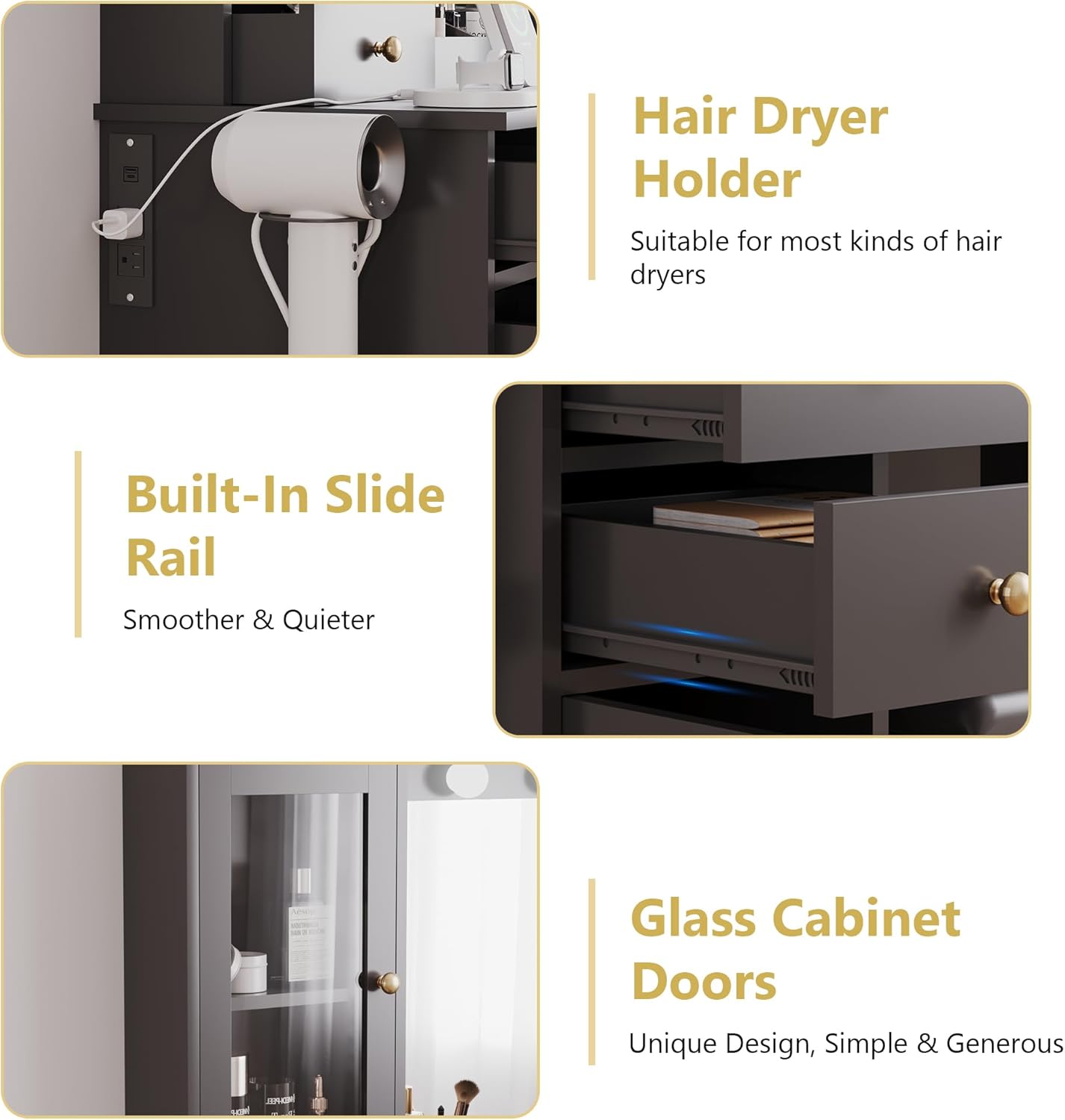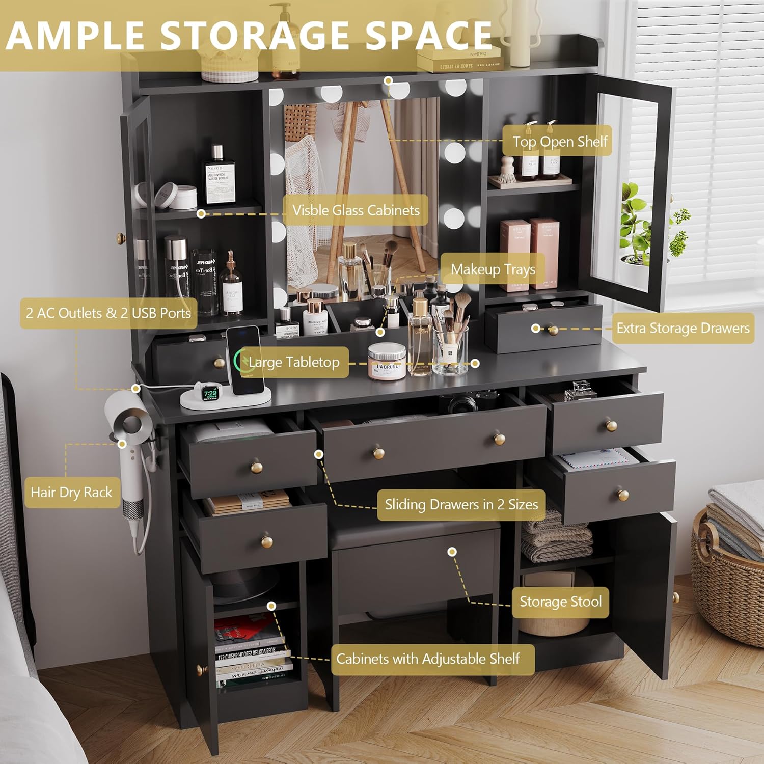 Makeup Vanity Desk with Mirror and Lights, Black Vanity Table Set with Storage Drawers, Charging Station, Cabinets & Chair, Large Dressing Table with RGB Ambient Light for Women Girls Bedroom Bathroom