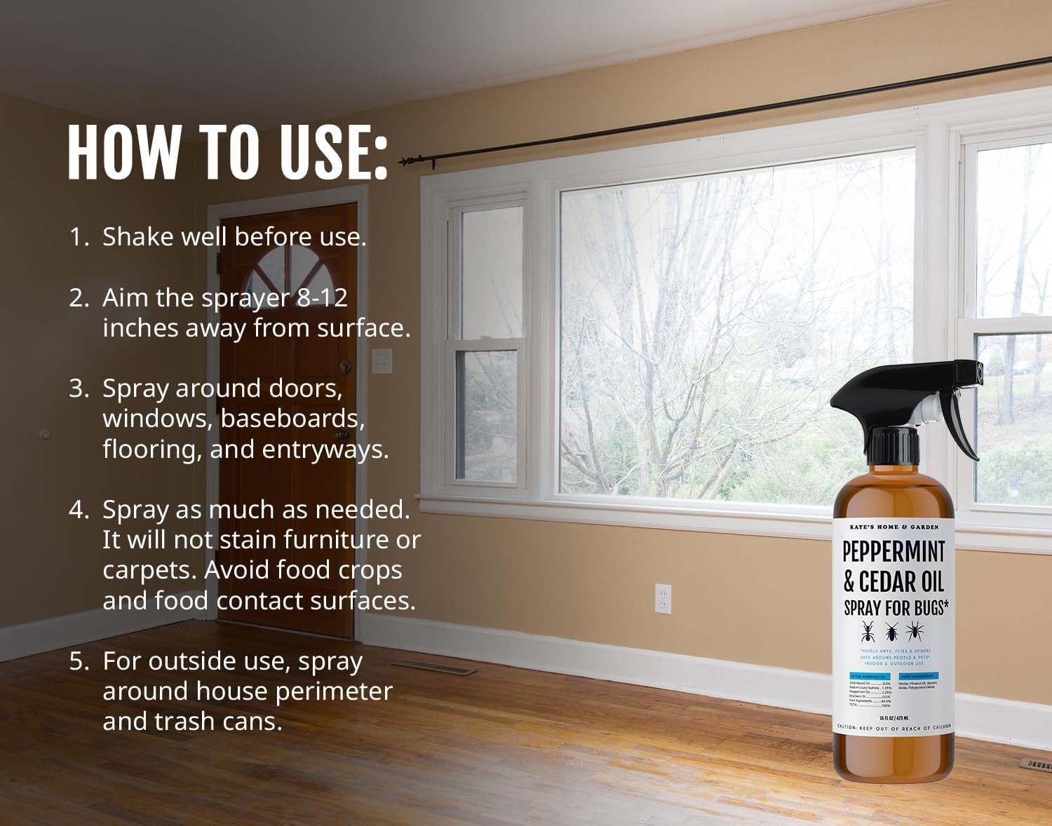 - PEPPERMINT OIL SPRAY FOR BUGS: This natural bug repellent is made with peppermint oil and cedarwood oil for pest control; it works indoor and outdoor by repelling bug, spiders, stink bugs, earwigs, flies, cats and rodents from crawling over all your house, basement, attics, and yard; this is why Kate's Home & Garden insect repellent is a great indoor insect & pest control spray for insects and is a great household supply and camping essential