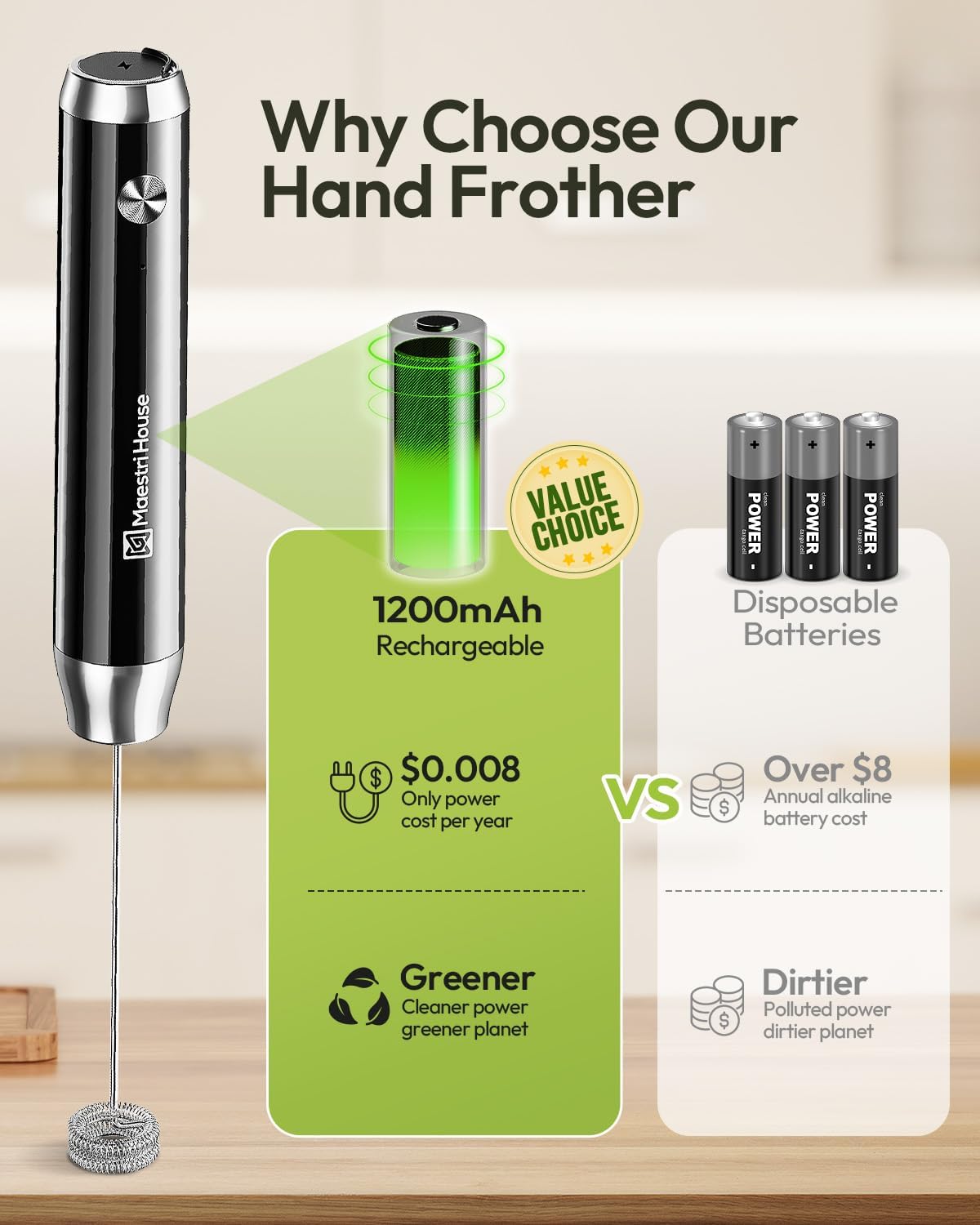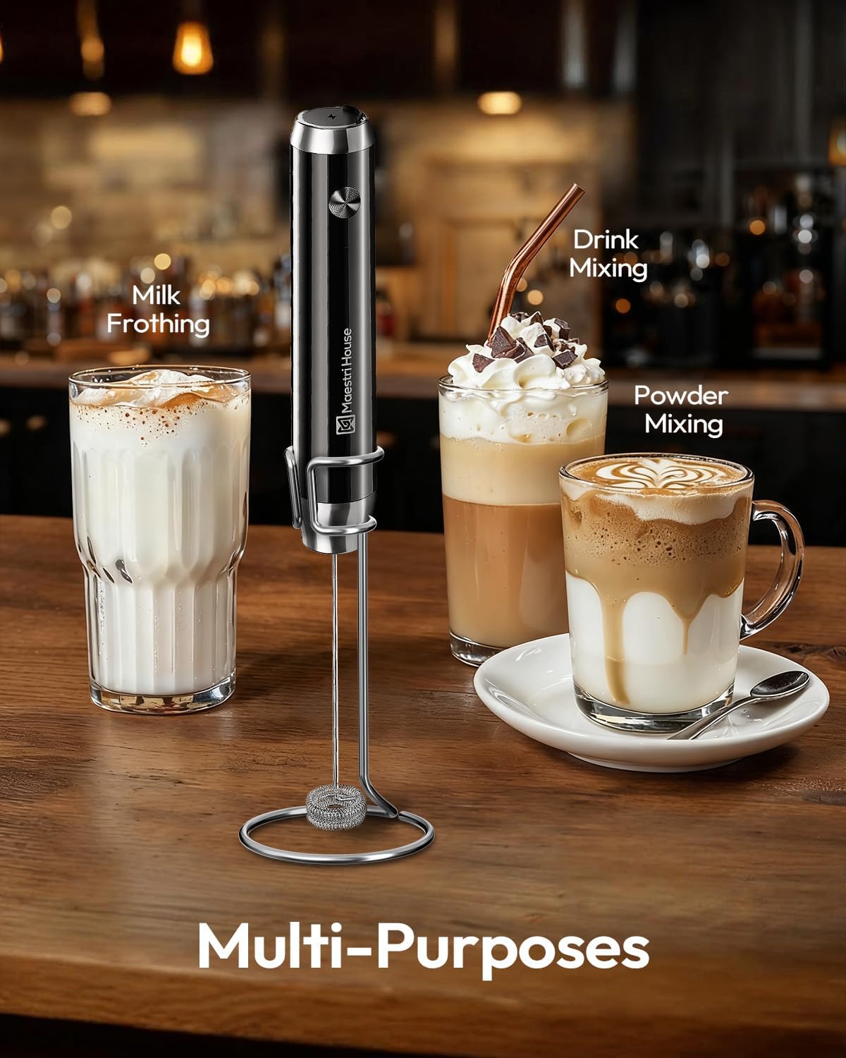 Maestri House Rechargeable Milk Frother with Stand, LunaFro Handheld Electric Foam Maker Waterproof Detachable Stainless Steel Whisk Drink Mixer Foamer for Lattes, Cappuccino