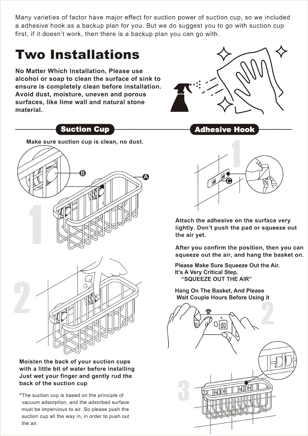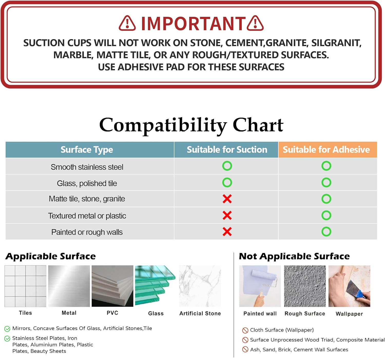 • This product includes the stainless steel basket and mounting accessories (adhesive pad + suction cups). Important Compatibility Notice – Suction cups work only on smooth, non-porous surfaces such as polished tile, stainless steel, or glass. For textured, stone, or matte finishes, use the included adhesive pad instead.