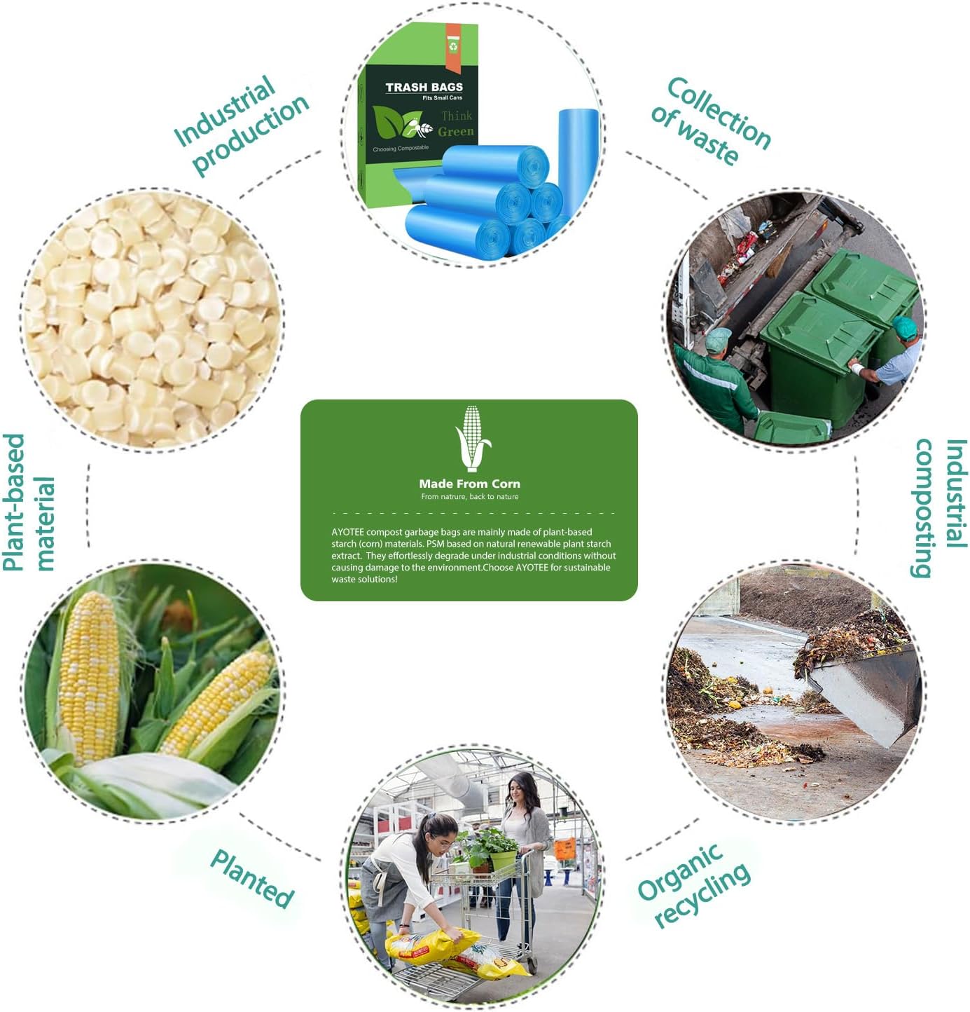 • Compostable Trash Bags Our small trash bags are all made of Plast arch material (PSM) with the U.S. standard ASTM D6866 PSM based on natural renewable plant starch extract, It not only has excellent leakage resistance and toughness. Not suitable for backyard composting, but degradable under industrial conditions without causing damage to the environment.