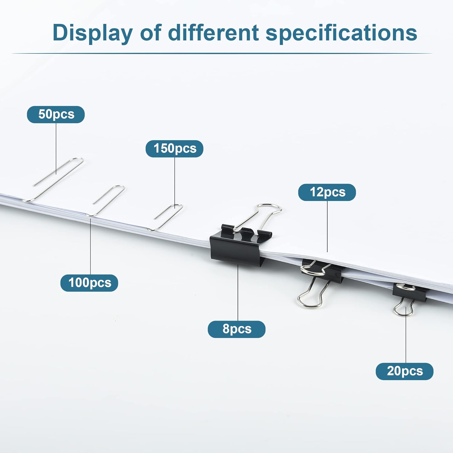 - Assorted sizes meet office desk accessories needs. - Jumbo 340pcs binder clips and paper clips set, each pack contain 150, 100, and 50 pieces of assorted paper clips (28mm, 33mm, 50mm). Get 20, 12, and 8 pieces of the paper binder clips (15mm, 19mm, 25mm), too!
