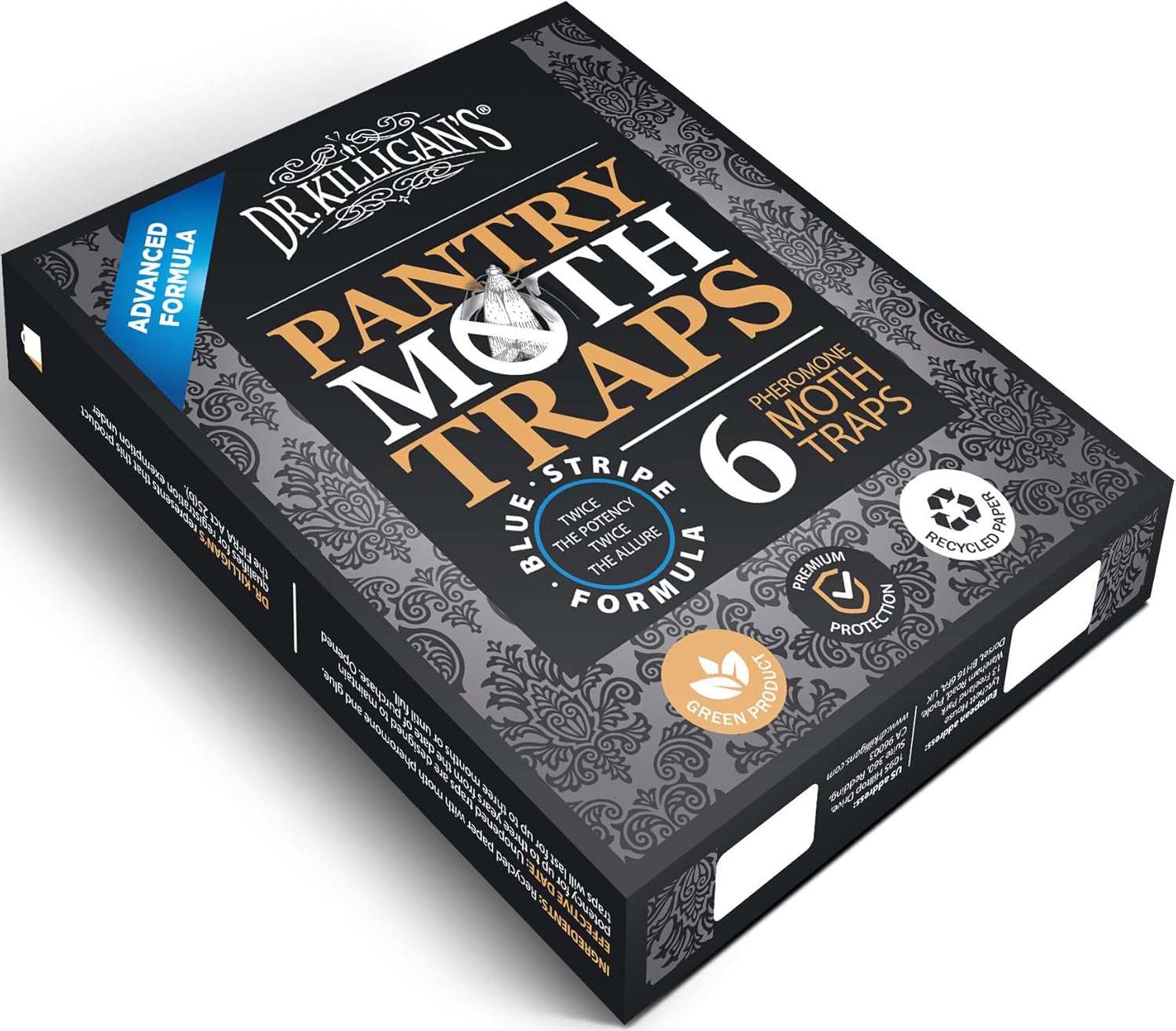 - Design Options — Dr. Killigan’s moth traps are also dressed to impress so you can display them with confidence. Choose between two unique design options when purchasing a 6-pack of Premium Pantry Moth Traps. Both options include the same proprietary, double-potent pheromones and the industrial-grade glue.