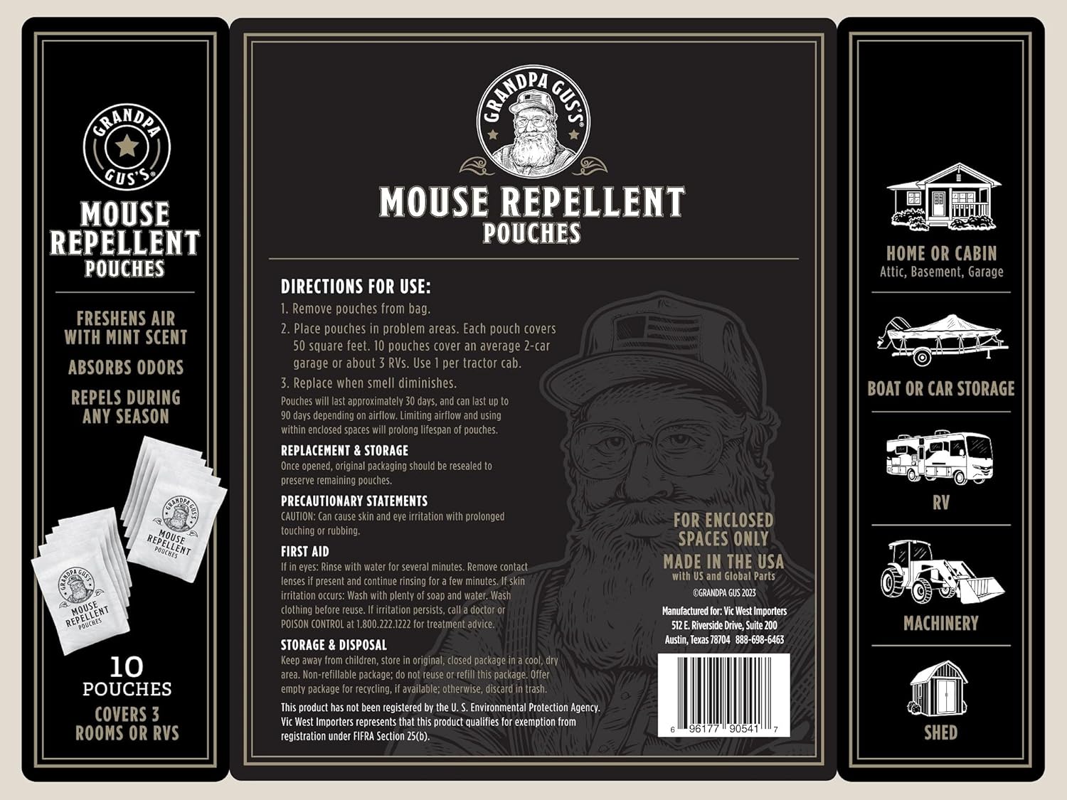 - Grandpa Gus’s Extra-Strength Mouse Repellent Pouches, Peppermint & Cinnamon Oil, Natural Rodent Deterrent Control for Garage, RV, Car, Basement, Attic, Storage, 1.75 Oz (Pack of 10)