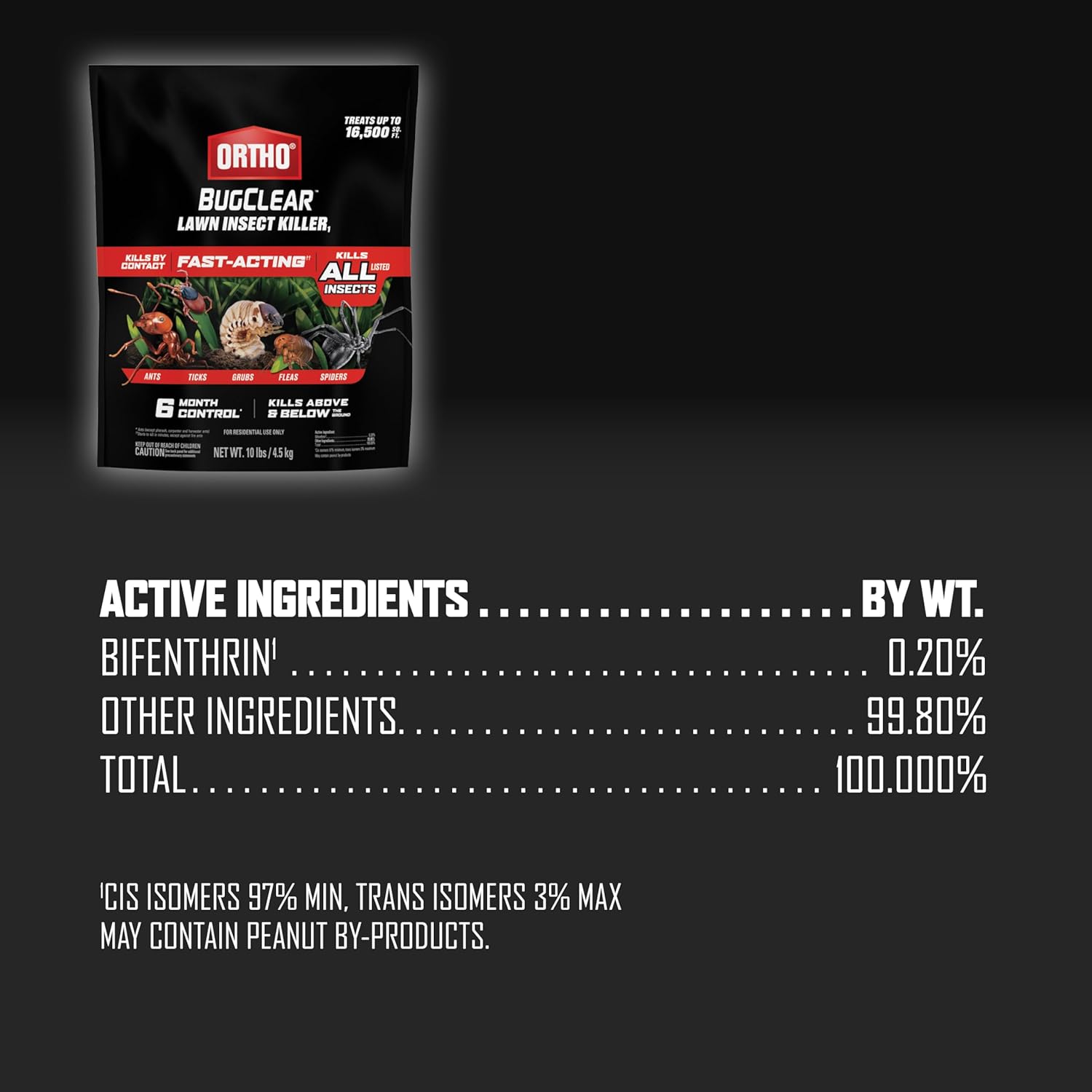 - Ortho BugClear Lawn Insect Killer1, Kills Ants, Spiders, Ticks, Fleas, Armyworms and Grubs, Treats up to 16,500 sq. ft., 10 lb.