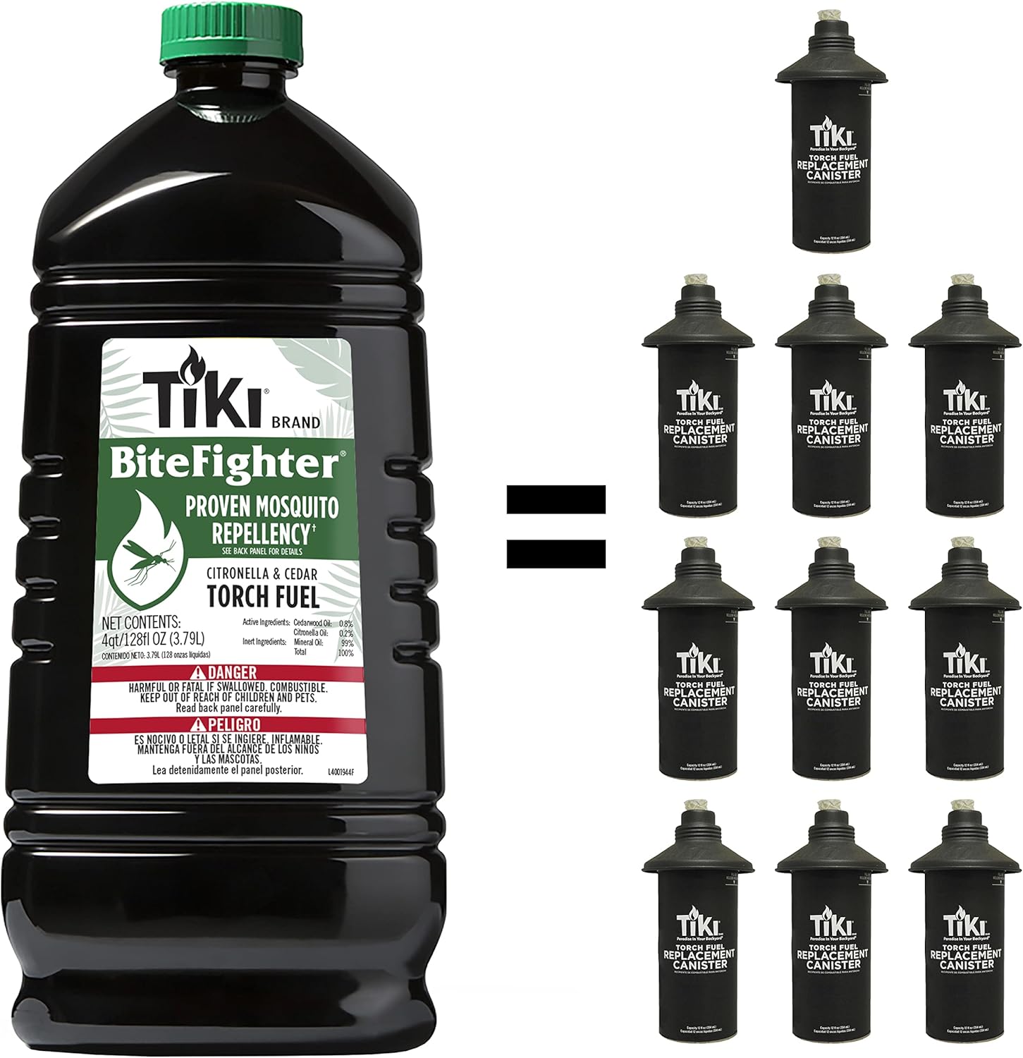 - TIKI BiteFighter Mosquito Repellent Torch Fuel - 1 Gallon (128 oz.), Citronella & Cedar Formula for Mosquito Repellency, Easy Pour Bottle, Use with Torches & Table Torches, Outdoor & Backyard Use
