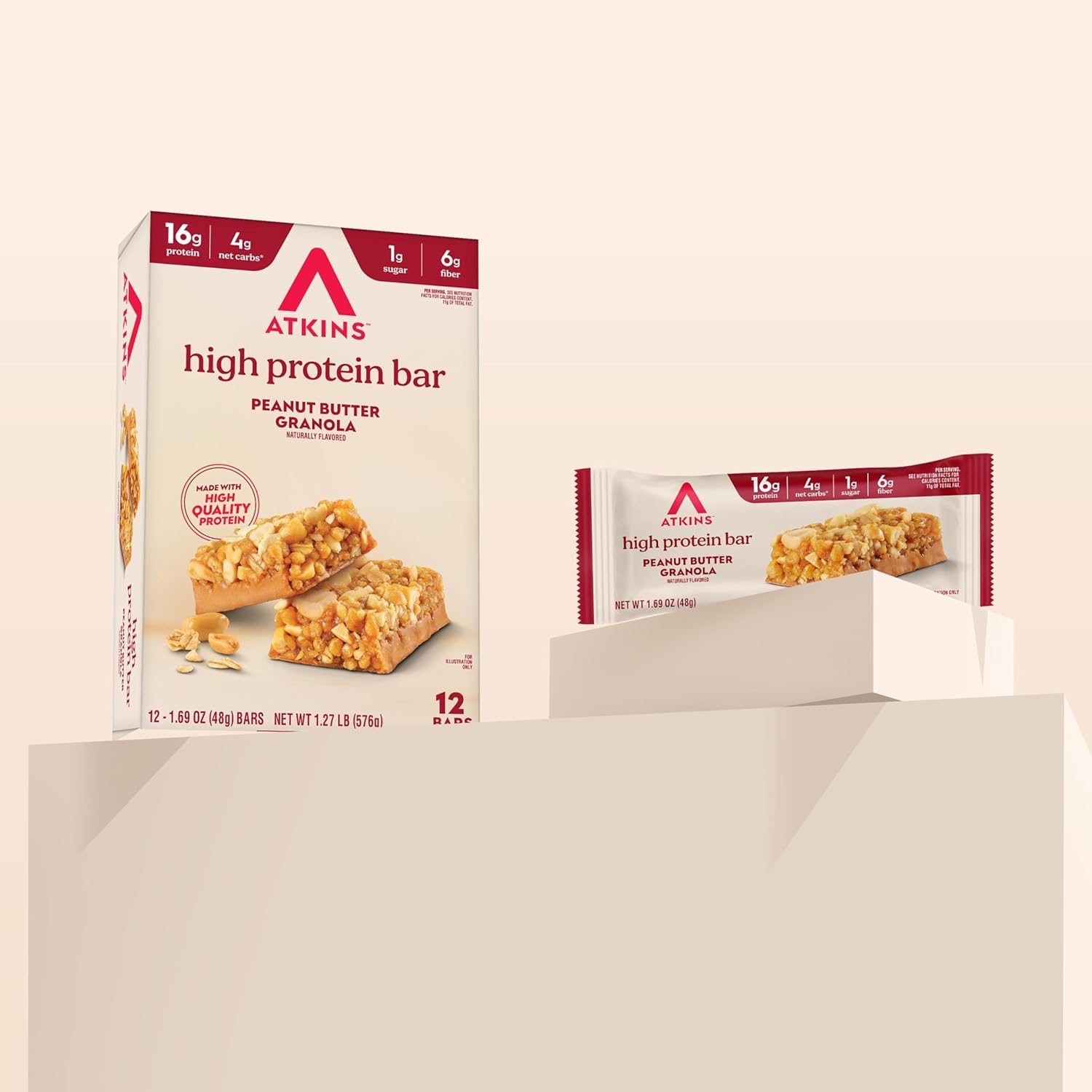 - Atkins Peanut Butter Granola High Protein Bar, High Fiber Snack , 16g Protein, 1g Sugar, 4g Net Carb, Protein Snack, 12 Count
