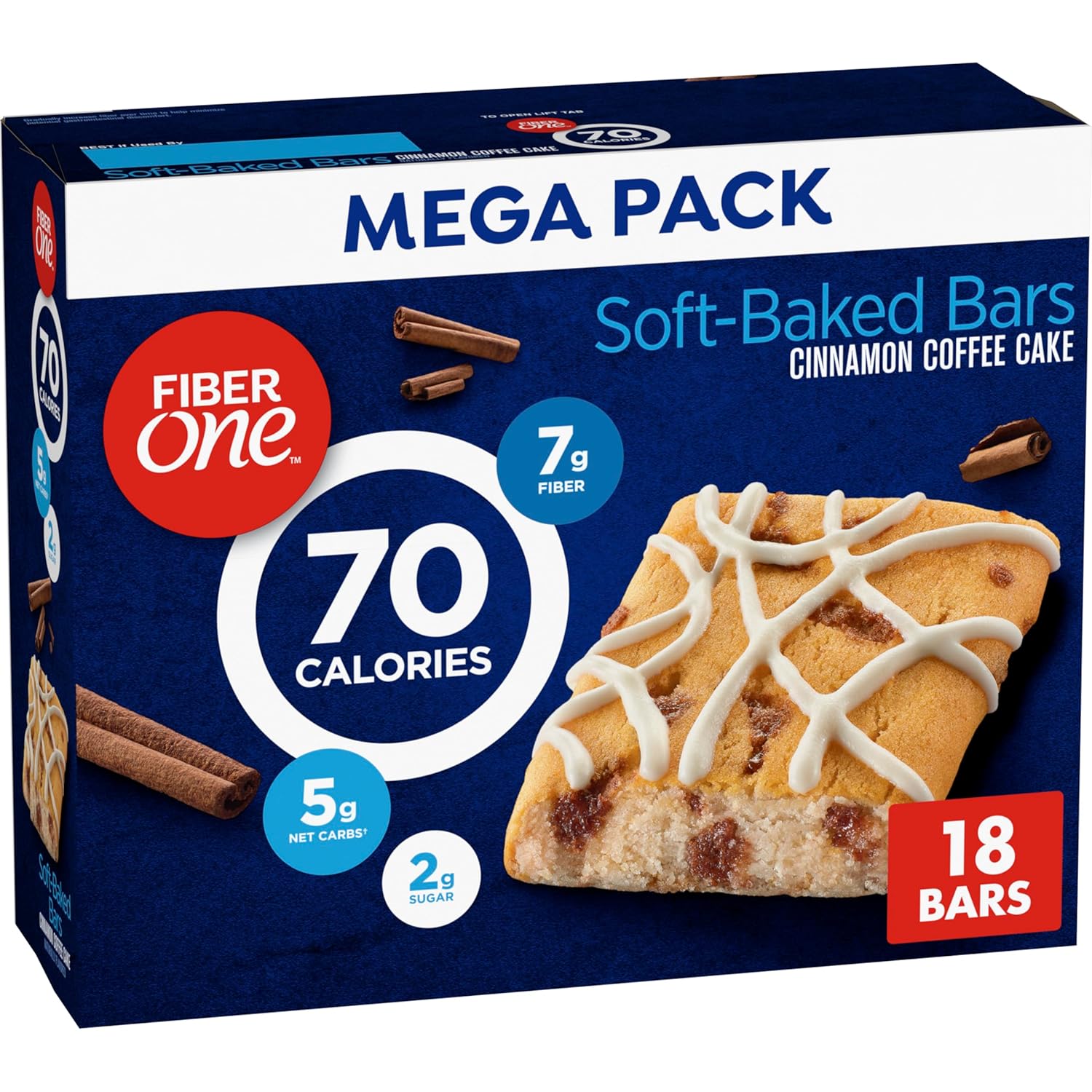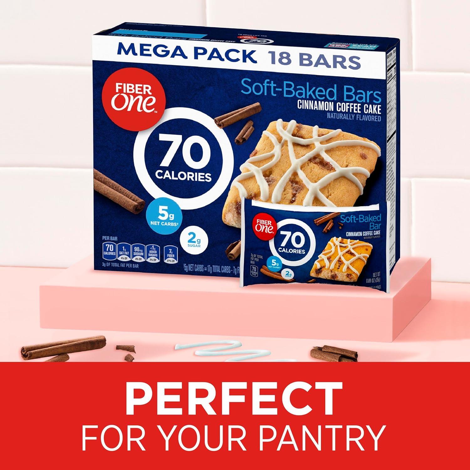 Contains – One box of Fiber One 70 Calorie Soft Baked Bars, Cinnamon Coffee Cake, Mega Pack, 18 bars (16 oz total), ready for instant snacking.
