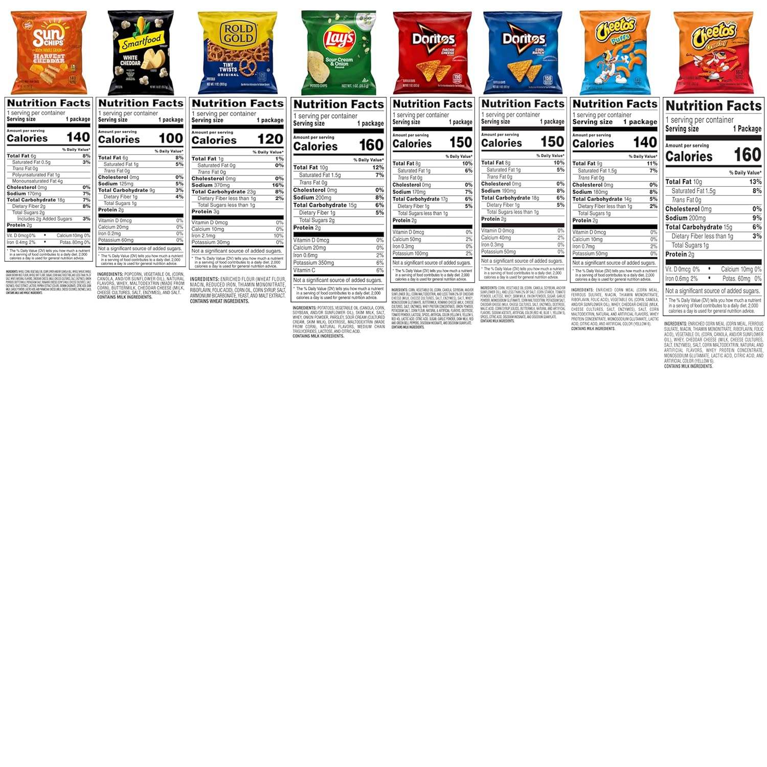 Package Includes: (8) 1 oz bags of Doritos Nacho Cheese, (6) 1 oz bags of Doritos Cool Ranch, (4) 1 oz bags of Lay's Sour Cream & Onion, (4) 1 oz bags of Rold Gold Tiny Twists, (4) 0.625 oz bags of Smartfood White Cheddar Popcorn, (6) 1 oz bags of Cheetos Crunchy, (4) 0.875 oz bags of Cheetos Puffs, and (4) 1 oz bags of Sunchips Harvest Cheddar.