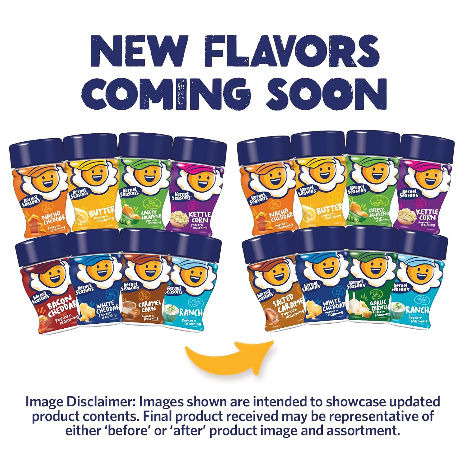 - Variety is the spice of life! Try out all Kernel Season’s Popcorn Seasoning has to offer with 8 mini shakers. Flavors include: White Cheddar, Nacho Cheddar, Ranch, Butter, Kettle Corn, Caramel Corn, Bacon Cheddar, and Cheesy Jalapeno