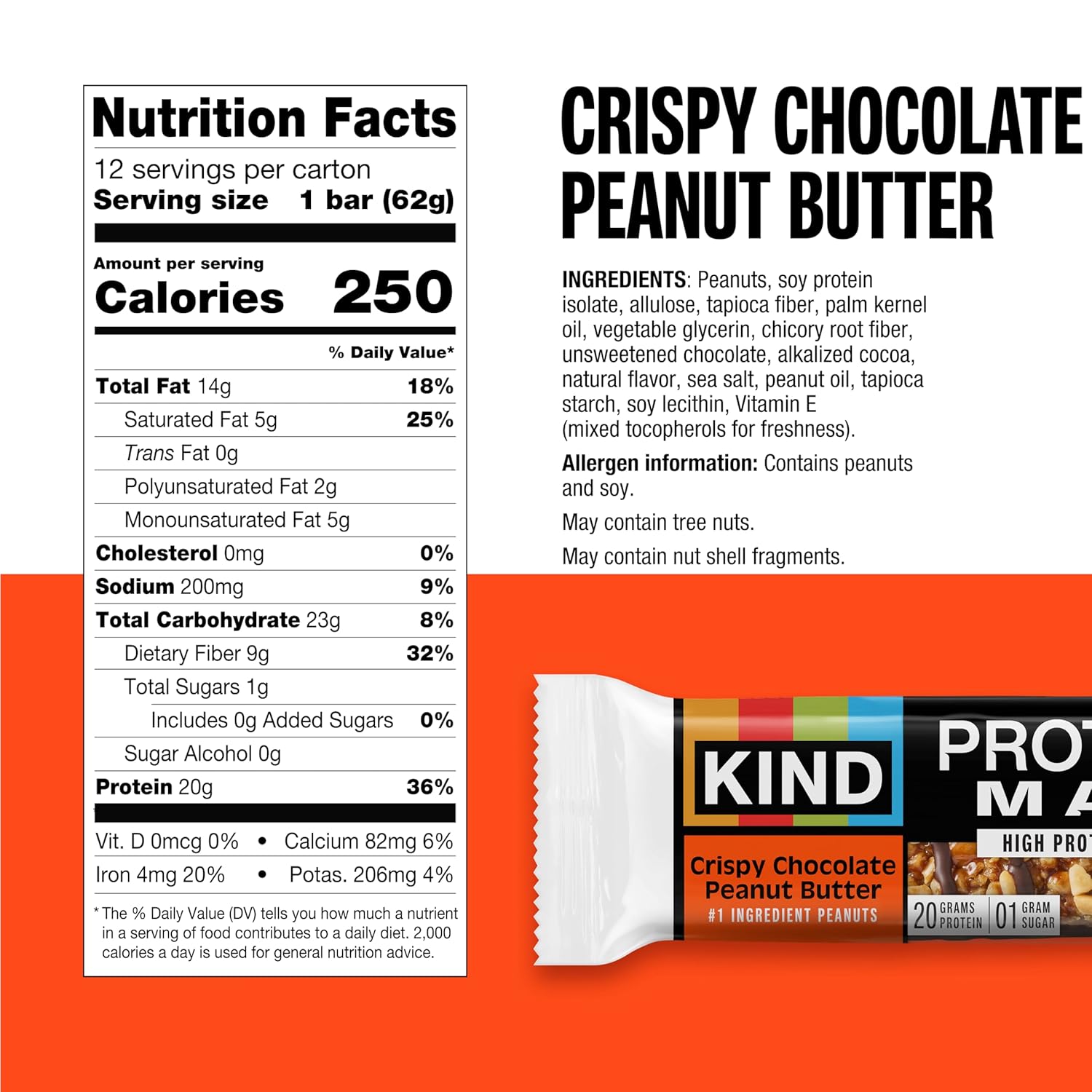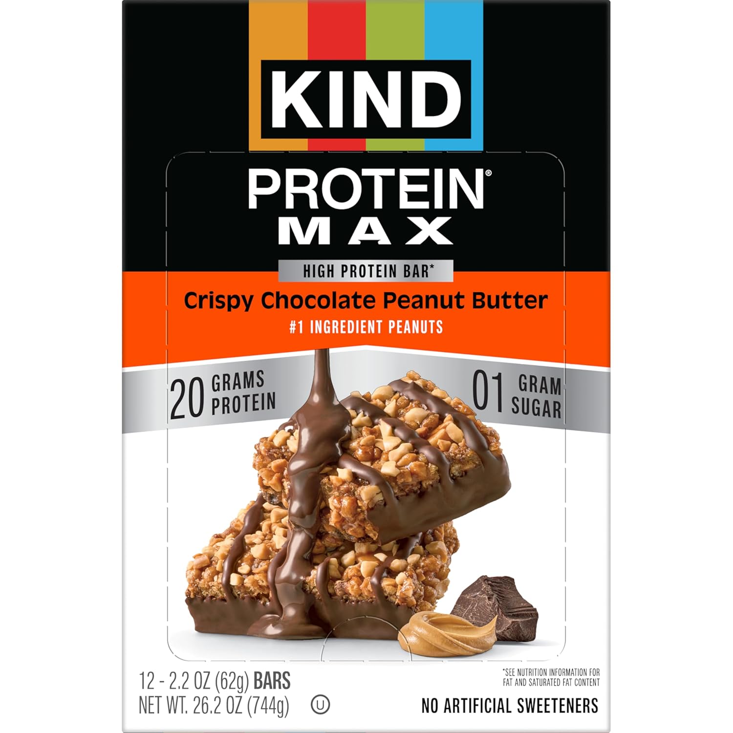 - KIND Protein MAX Crispy Chocolate Peanut Butter Snack Bars, 20g of Protein, Keto Friendly, 1g of Sugar Per Bar, Gluten Free, 12 Count Box