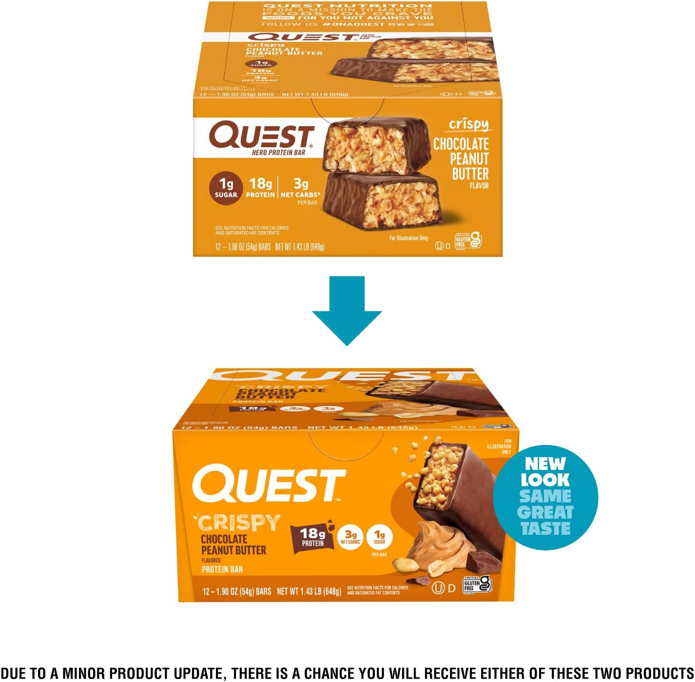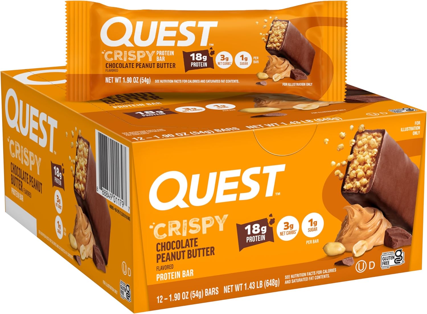 - Quest Nutrition Crispy Chocolate Peanut Butter Hero Protein Bar, 18g Protein, 1g Sugar, 3g Net Carb, Gluten Free Protein Snack, Keto Friendly, 12 Count