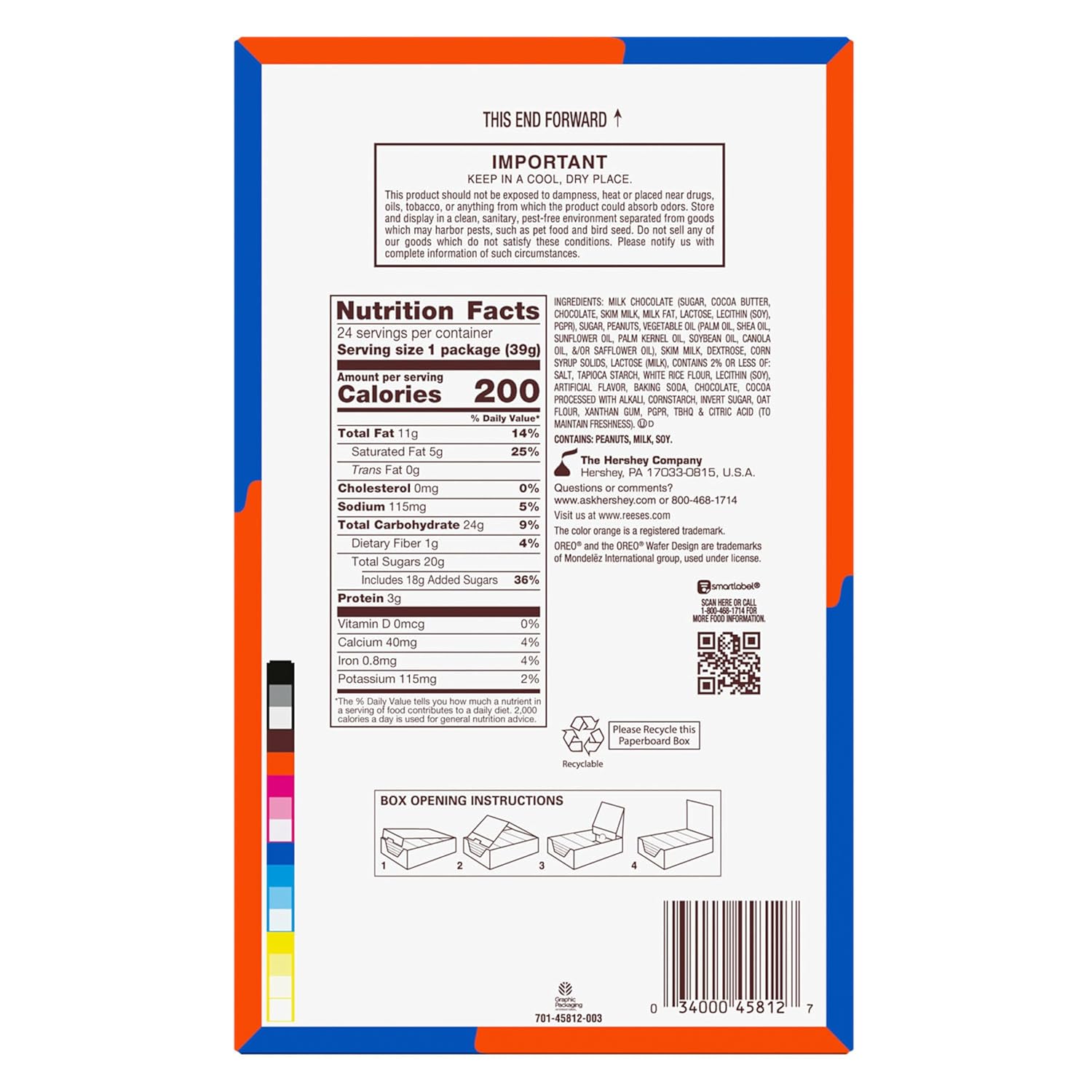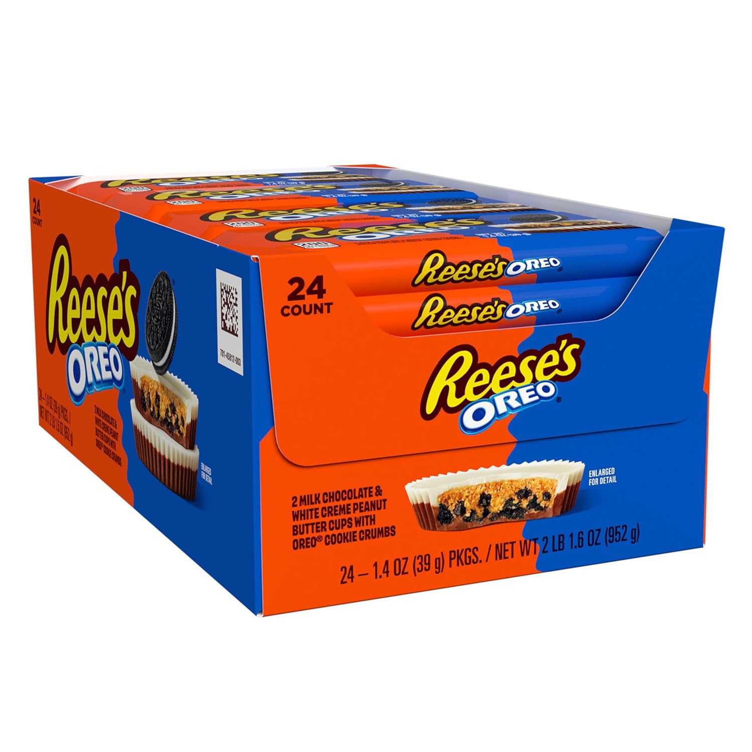 - Contains twenty-four (24) 1.4-ounce packs of REESE'S OREO Milk Chocolate and White Creme Peanut Butter Cups Candy in a bulk box