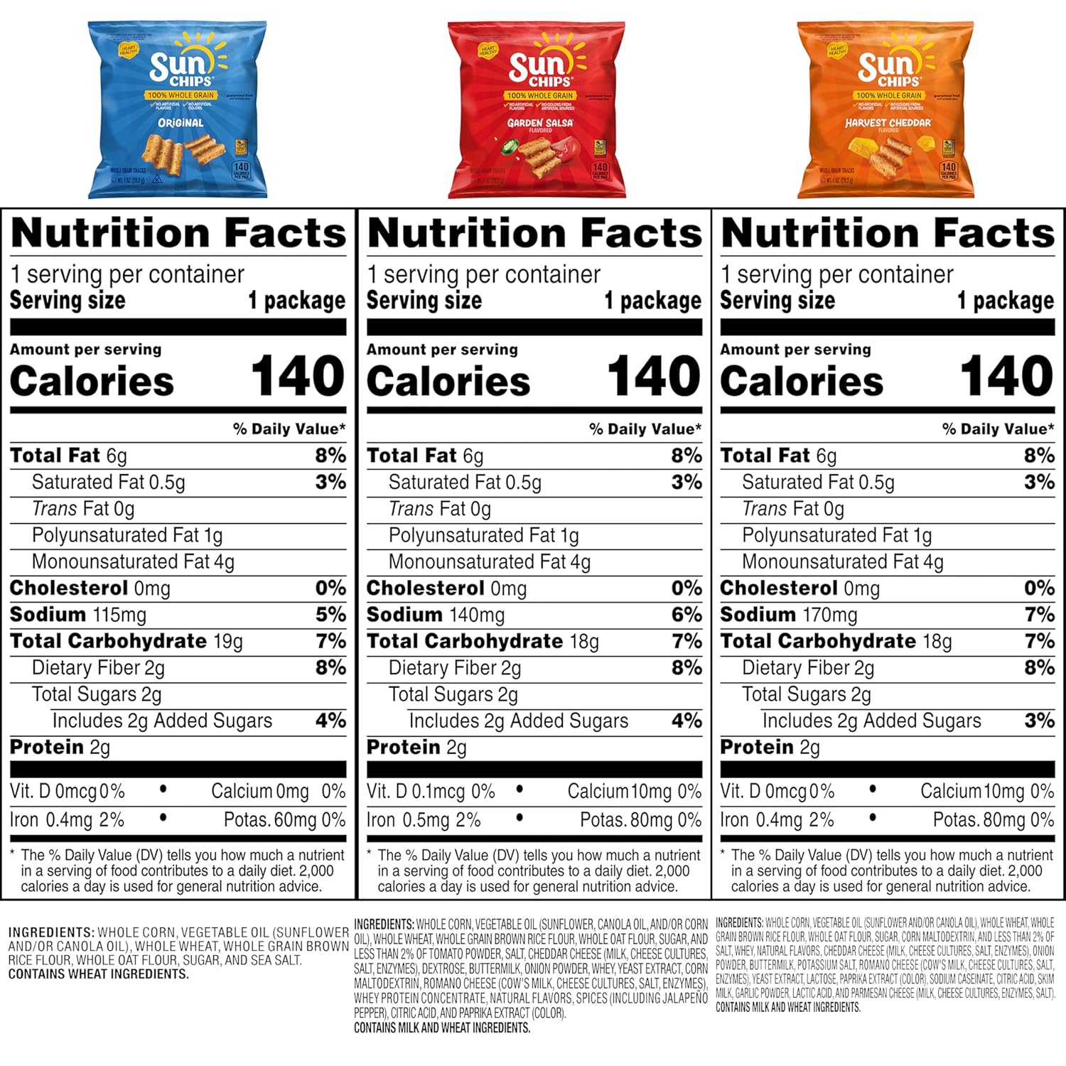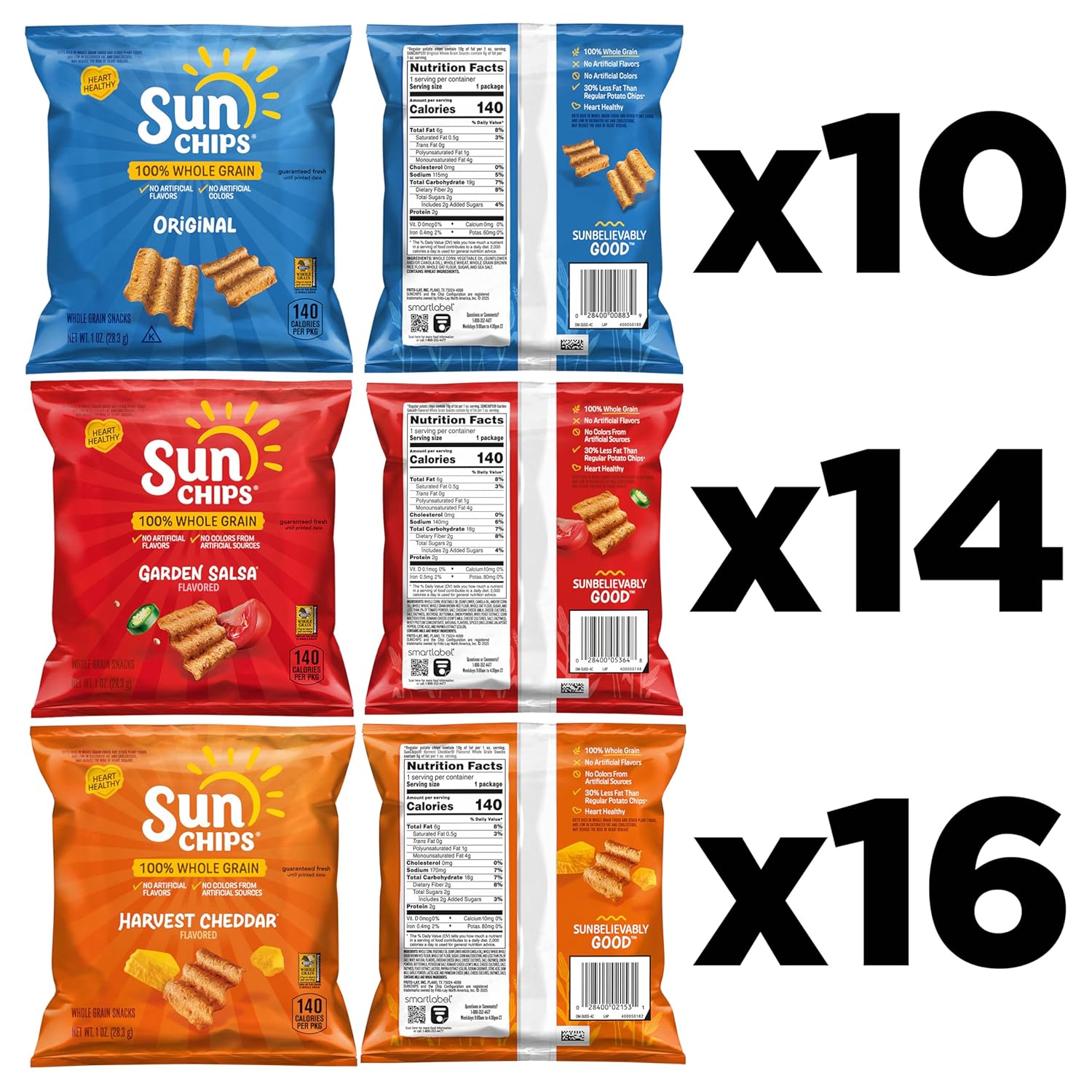 - Includes 40 (1 oz) bags of SunChips 100% Whole Grain Chips, (16) Harvest Cheddar, (14) Garden Salsa, (10) Original flavors