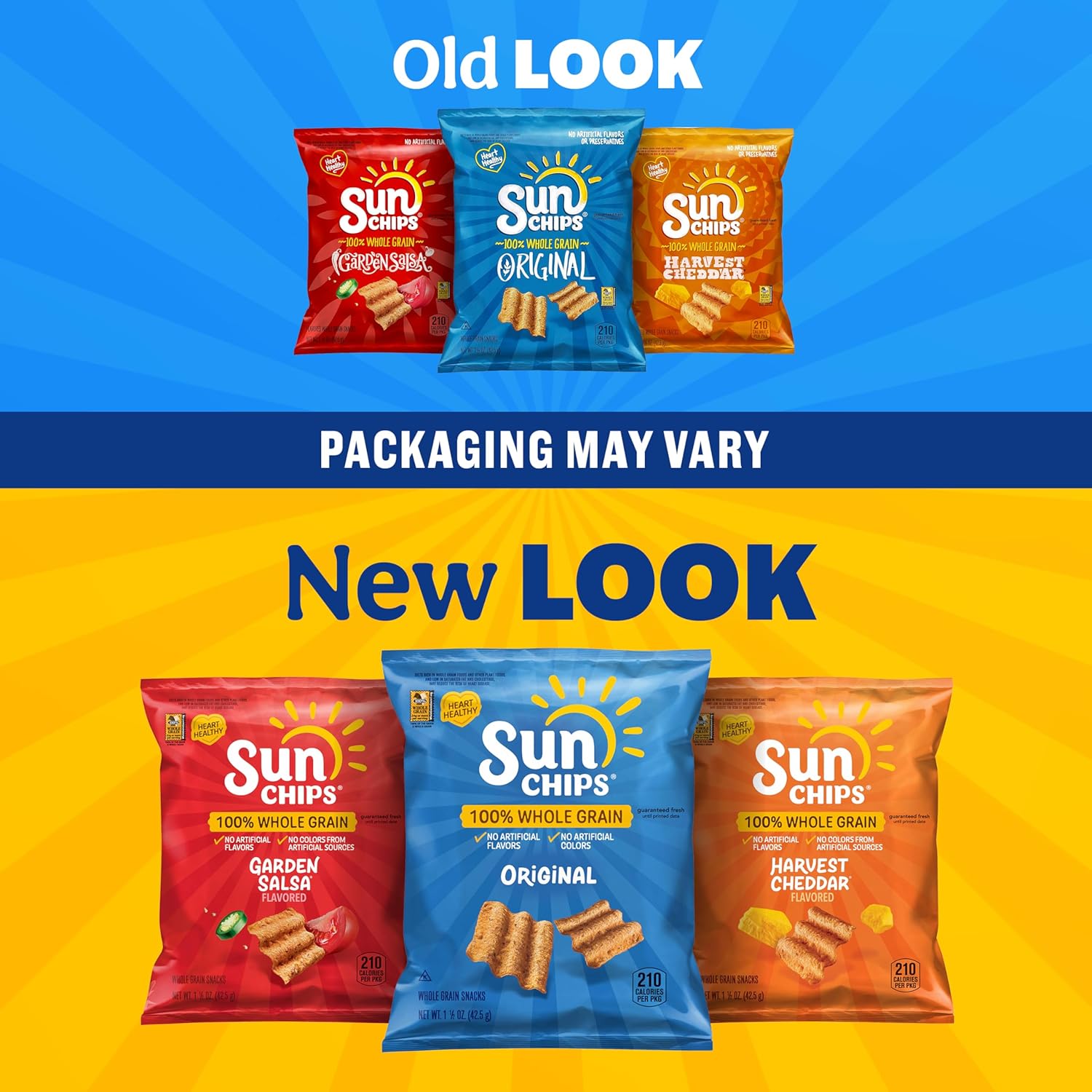 - Heart Healthy SunChips snacks are made with 100% Whole Grains and 30% less fat than regular potato chips