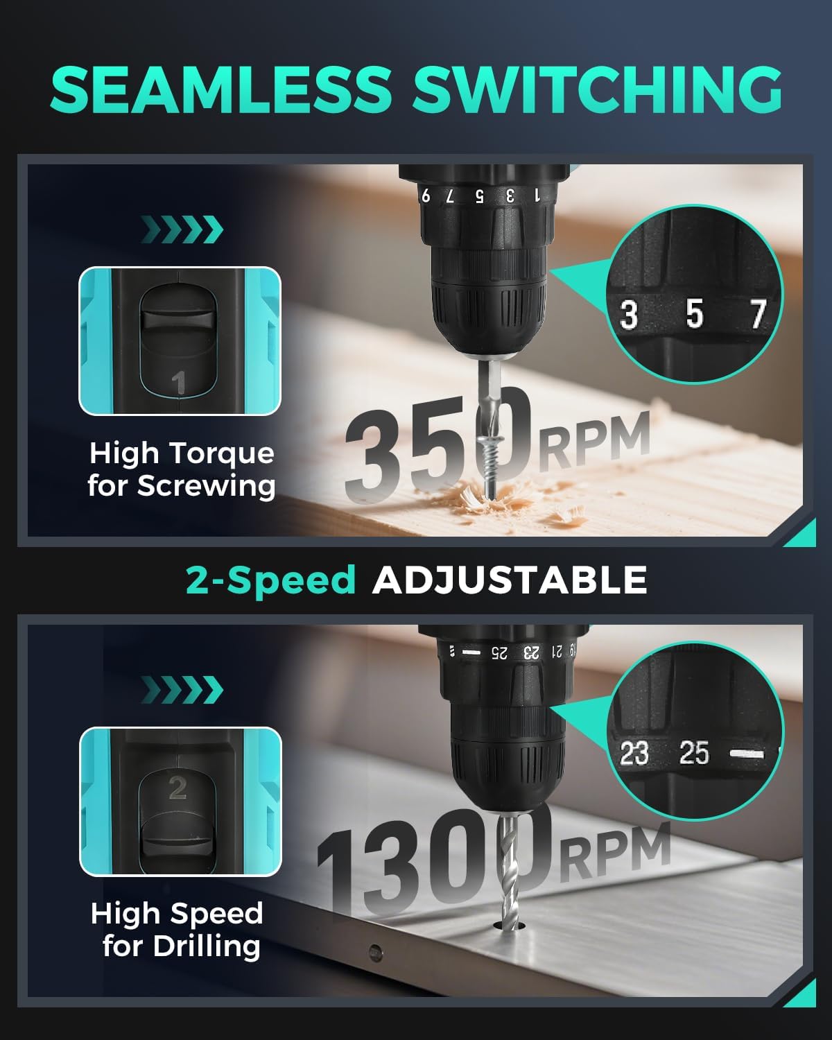 - 【20 Voltage & 2 Variable Speeds】 Higher voltage means more torque-spinning strength to overcome resistance. This 2 variable-speed ( 0-350 & 0-1300 RPM ) cordless drill with an adjustable clutch gives you the versatility for drilling different materials and using a variety of bits. The low speed is for driving screws, the high speed is for drilling holes.