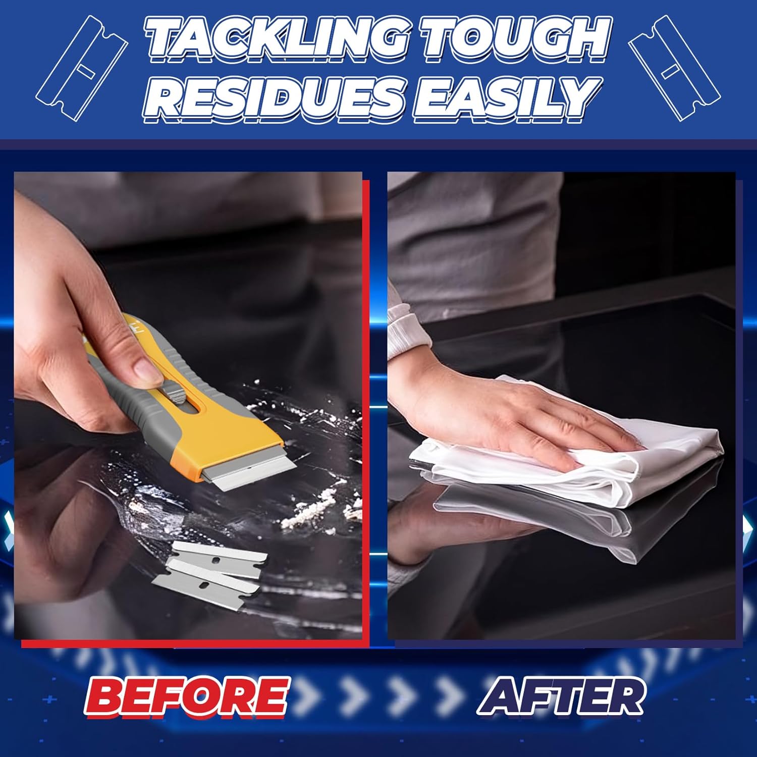- VERSATILITY USE: Metal razor blades fit all universal razor blade scrapers and are suitable for various scraping tasks. Whether at home, workplace, or in industrial environments, they effectively remove surface stains, residues, and stickers. They can be used on windows, glass cooktops, bottles, tiles, metal surfaces, and more.