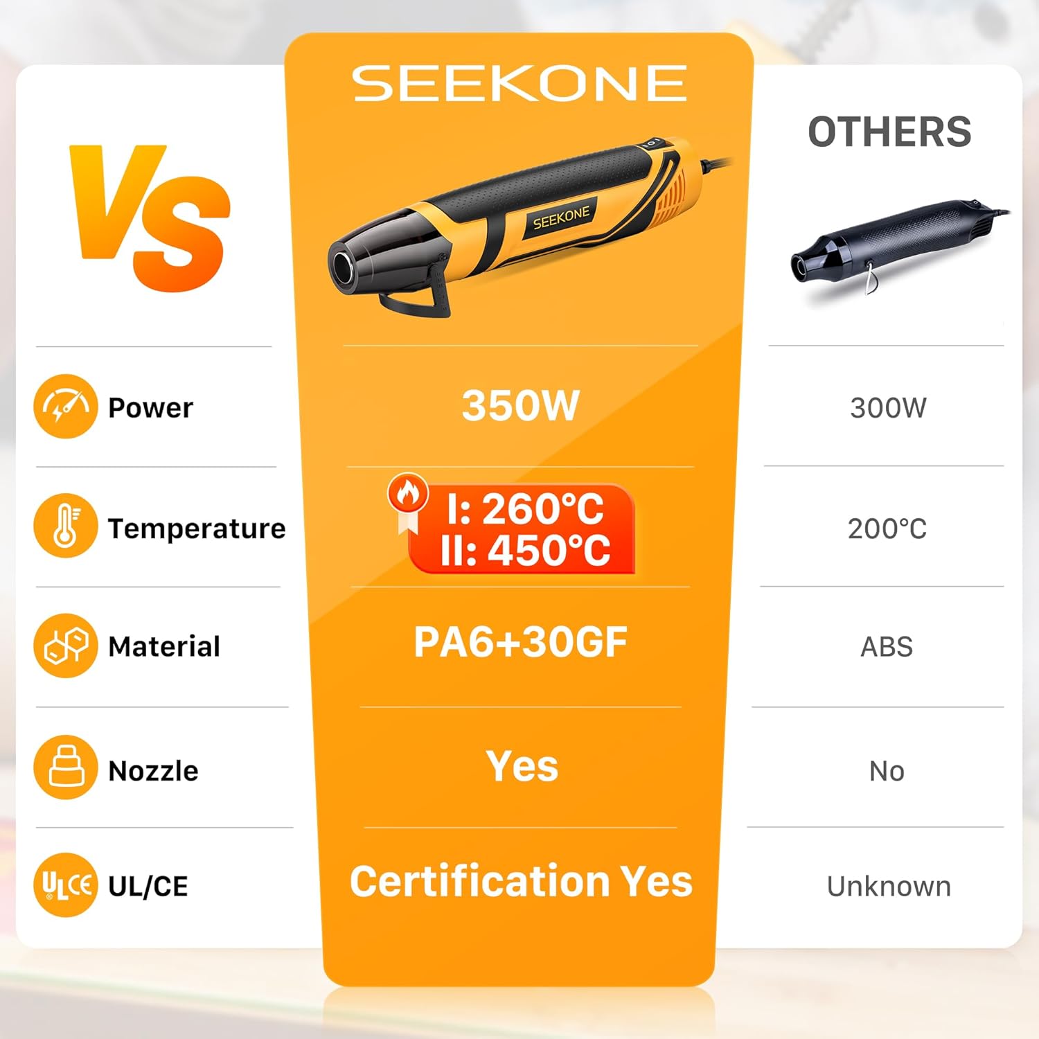 - 【Dual Temperature Mode】SEEKONE HG350 mini heat gun has been upgraded to a new dual temperature mode: 500°F (260°C) and 842°F (450°C), which can meet different process needs, whether you are performing delicate tasks or various DIY projects, this heat gun provides the perfect temperature range for every application