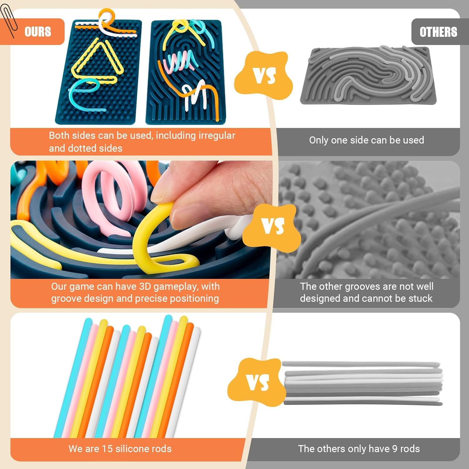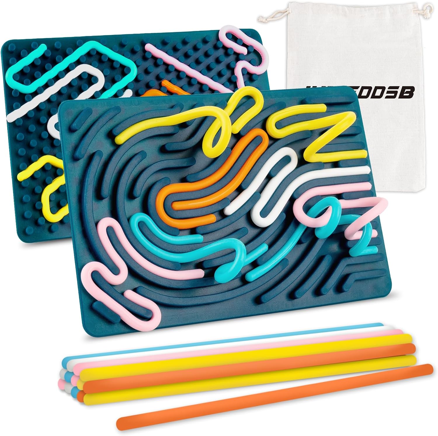 • Safe and High Quality: The sensory activity board is made of high-quality, non-toxic silicone. The materials are durable, odorless, and have obtained the Children's CPC certification to ensure safety. The board has different patterns on both sides: the front side is irregular, while the back features dotted graphics. It comes with 15 silicone rods, providing diverse and three-dimensional gameplay.