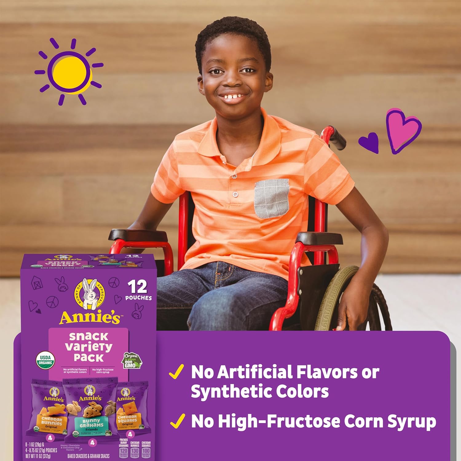 - Annie's Organic Variety Pack, Cheddar Bunnies, Bunny Grahams and Cheddar Squares, 12 Pouches, 11 oz