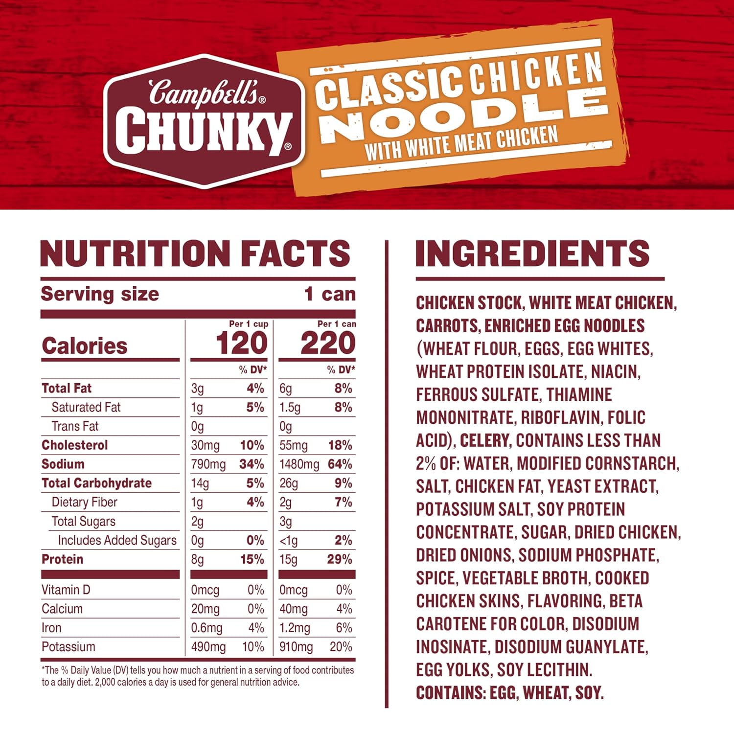 - Campbell's Chunky Soup: Eight (8) 16.1 oz cans of Campbell’s Chunky Classic Chicken Noodle Soup