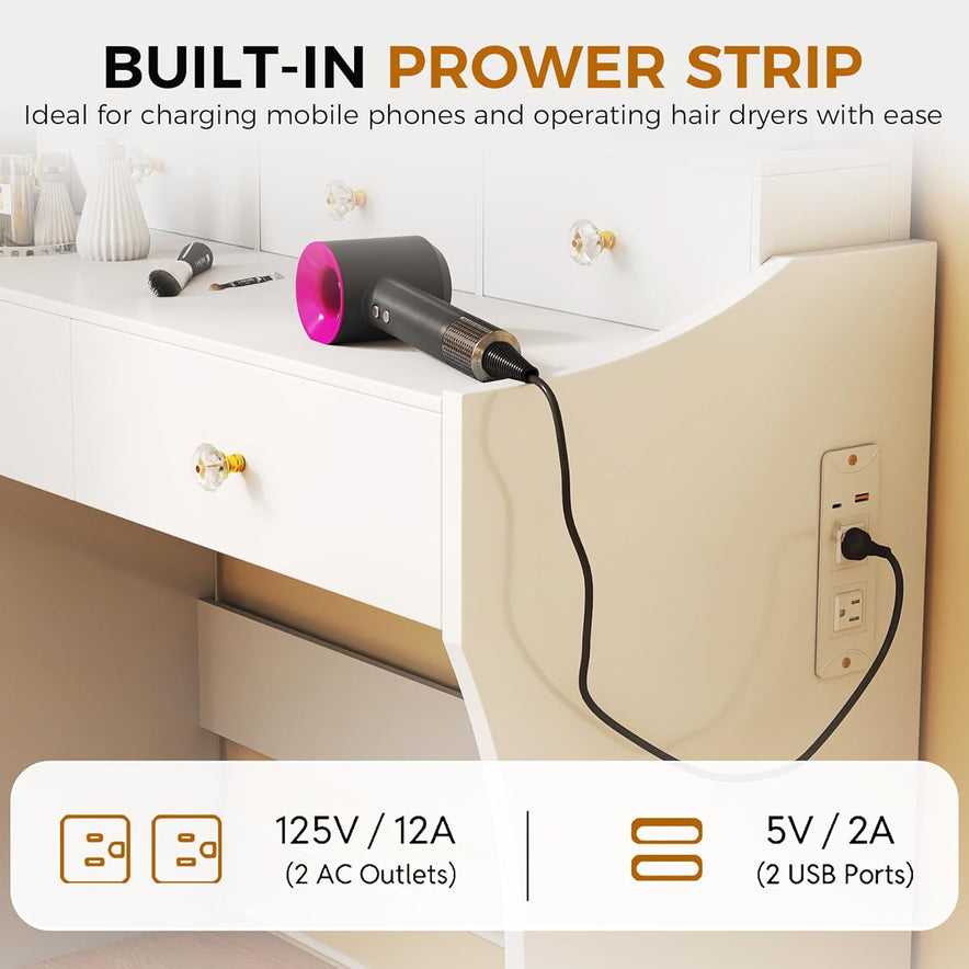 - Built-in Charging Station - The built-in power strip contains 2 standard outlets and 2 USB ports, allowing you to charge multiple devices at the same time. This black vanity desk can bring much convenience for your makeup routine and daily life